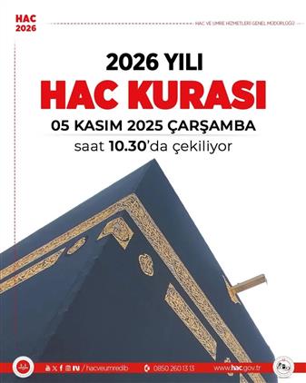 Bakanlıklararası Hac ve Umre Kurulu kararıyla, milyonlarca hacı adayımızın hasretle beklediği 2026 yılı hac kurası; 05 Kasım 2025 Çarşamba günü saat 10.30’da Diyanet İşleri Başkanlığı 15 Temmuz Milli İrade Şehit Ali Alıtkan Konferans Salonu’nda vatandaşlarımızın da katılımıyla noter ve basın mensupları huzurunda gerçekleştirilecektir.
