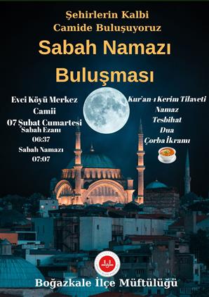 Evci Köyü Camimizde 07 Şubat Cumartesi günü düzenlenecek olan Sabah Namazı Buluşmasına tüm halkımız davetlidir.