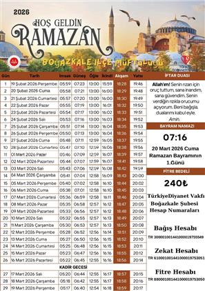 Boğazkale İlçe Müftülüğümüzce basımı yapılan ilçemize ait Ramazan ayı imsakiyeleri İlçe Müftümüz Önder ARIK ve müftülük personelimiz tarafından dağıtıldı. 2026 Yılı Boğazkale Ramazan ayı imsakiyesini camilerimizden temin edebilirsiniz. Cenabı Hak Ramazan ayını ilçemiz, ülkemiz ve tüm İslâm âlemi için hayırlara vesile eylesin.