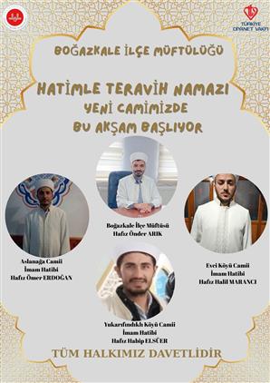 Boğazkale İlçemizde geçen yıl itibariyle başlanılan bu yıl ikincisi organize edilecek olan hatimle teravih namazı Yeni Camimizde bu akşam başlayacaktır. Tüm halkımızı bekleriz.