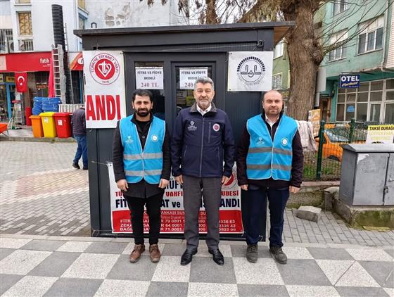 Çarşıbaşı Camii karşısı havuz meydanı önünde kurulan stantta, vatandaşların bağışları makbuz karşılığında teslim alınıyor ve ihtiyaç sahiplerine ulaştırılıyor.